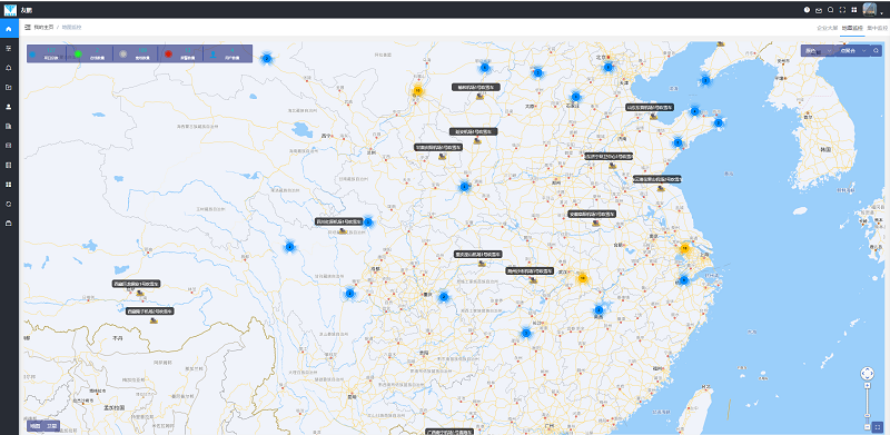 在地图监控界面中,可以直观 地看出设备的在线情况以及设备报警情况;界面主体部分的地图上可以看到车辆所在的区域。同时还能设计个性化的企业大屏显示。